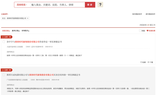 裁判文书网显示,与时代装饰相关的裁判文书共有240篇之多。大多数为服务合同、买卖合同、装修合同纠纷等,原因包括:房屋装修后时代装饰未及时支付全部款项;向时代装饰提供货物其未支付货款等。