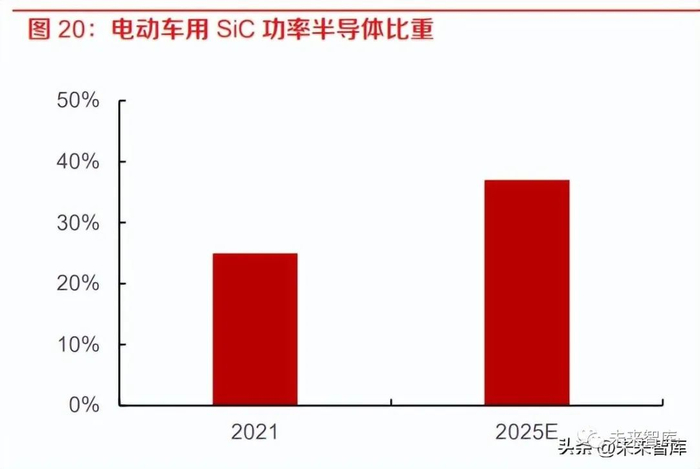 2018 年特斯拉将碳化硅导入 Model 3,新能源车企竞相布局碳化硅器件。特斯拉 Model 3 首次采 用意法半导体和英飞凌的 SiC 逆变器。相较于 Si-IGBT,碳化硅模块开关损耗降低 75%、系统效 率提升 5%、尺寸更小。在特斯拉导入碳化硅器件后,多家新能源汽车厂商纷纷跟进。2020 年, 比亚迪将自主研发制造的 SiC MOSFET 功率器件搭载在汉 EV 四驱高性能版上,实现了 200KW 的输出功率,功率密度提升一倍。