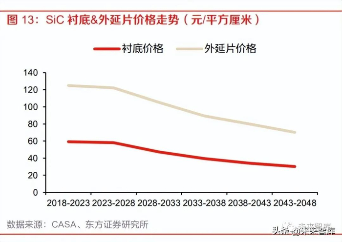 4)碳化硅器件成本逐步下调,渗透增加。碳化硅制备难度大、长晶速度慢、损失率高,导致碳 化器件价格高昂、渗透率较低。根据我国第三代半导体产业技术创新战略联盟(CASA)数据显 示,SiC功率器件最主要的原材料成本——SiC衬底、外延片的价格近年来持续下降,原因有:第 一,伴随大直径衬底占比不断提高,衬底单位面积生长成本下降;第二,单晶的平均可用厚度仍 会持续增加,这将不断降低单位面积衬底成本;第三,衬底质量和晶片供货量的提高,以及外延 晶片成品率的提高,推动 SiC 器件成本逐步降低。未来 SiC 各环节成本有望持续下降,并迎来对 于下游产业的加速渗透。
