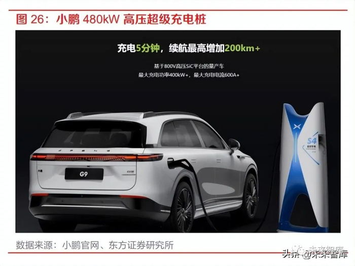 800V 高压平台需要电源产品配套升级,充电桩等迎来发展良机。当动力电池电压平台升级到 800V,当前的 OBC、DC/DC 及充电桩等电源产品都需要从 400V 等级提升至符合 800V 电压平台 的应用,SiC 器件由于其优异的特性也将开始大规模的应用。以充电桩为例,800V 高压充电桩在 设计架构上区别于 400V 的重要特点是需要配置 SiC MOSFET,以达到更快的充电速度和更好的 器件耐压性。22 年 Wolfspeed 宣布参与搭载 SiC 技术的直流快速充电桩项目,总功率可达 350 kW,成本可降低 20-30%。国内车企也开始发力,广汽埃安于 2021 年 8 月发布 480kW 超级充电 桩,小鹏也宣布 22Q4 起部署 480kW 高压超充桩,实现充电 5 分钟续航 200 公里。