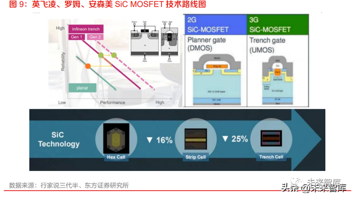 1)受益于 SiC MOSFET 供应商技术进步,碳化硅用量压缩、成本下降。特斯拉减少碳化硅器件 用量可能得益于 SiC MOSFET 供应商技术进步。近年来,特斯拉供应商意法半导体的 SiC MOSFET 芯片尺寸一直在缩小,如果按照第 3 代 MOSFET 面积是第 2 代的 1/4 来算,芯片面积 刚刚好缩小了 75%。MOSFET发展途径是:持续降低比电阻,功率不变情况缩小芯片面积。目前 SiC MOSFET 已发展到第三代,英飞凌和罗姆技术路线是从平面栅向沟槽栅过渡;安森美是改变 元胞形状和沟槽栅。
