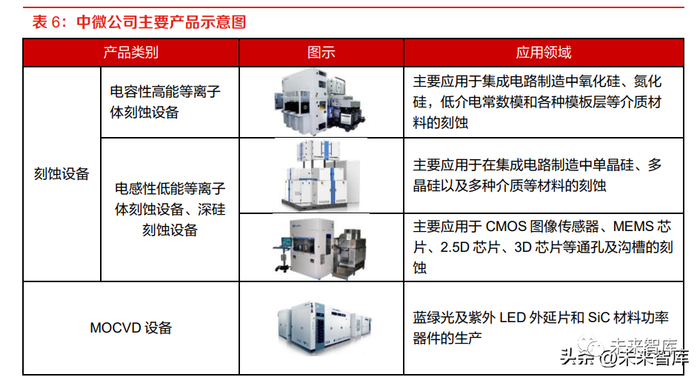 中微公司主要从事高端半导体设备及泛半导体设备的研发、生产和销售。公司基于在半导体设备 制造产业多年积累的专业技术,涉足半导体集成电路制造、先进封装、LED 外延片生产、功率器 件、MEMS 制造以及其他微观工艺的高端设备领域。1)等离子体刻蚀设备:已应用于国际一线 客户从 65 纳米到 14 纳米、7 纳米和 5 纳米及更先进的集成电路加工制造生产线及先进封装生产 线。2)MOCVD 设备:在行业领先客户的生产线上大规模投入量产,公司已成为世界排名前列的 氮化镓基 LED 设备制造商。截至 2022 年 6 月底,公司设备累计付运台数达 2654 个反应台,在 客户 73 条生产线全面量产。