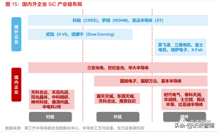 国内厂商加速布局,发展空间巨大。国内企业也在积极研发和探索 SiC 器件的产业化,已经形成 相对完整的 SiC 产业链体系,部分产业节点已有所突破。SiC 衬底方面,天岳先进在半绝缘 SiC 衬底的市场占有率连续三年保持全球前三;天科合达在国内率先成功研制 6 英寸 SiC 衬底,并已 实现 2-6 英寸 SiC 晶片的规模化生产和器件销售。SiC 外延片方面,厦门瀚天天成与东莞天域可 生产 2-6 英寸 SiC 外延片。SiC 器件方面,国内厂商主要有泰科天润、瀚薪、扬杰科技、中电 55 所、中电 13 所、科能芯、时代电气等。模组领域,目前 SiC 市场斯达半导、河南森源、常州武进科华、时代电气处于起步阶段。中国厂商在围绕 SiC 衬底生产上正在缩短与国外差距,未来若能 在 6 英寸和 8 英寸的 SiC 晶圆良率和成本上进一步实现突破是竞争的关键。