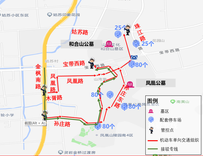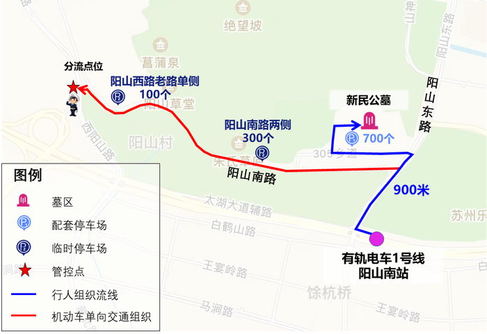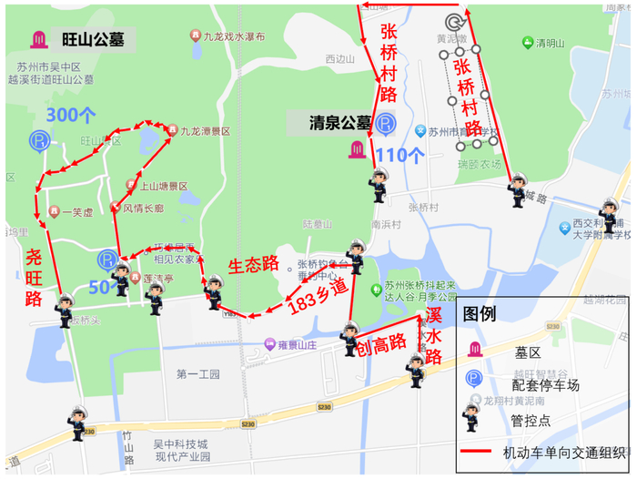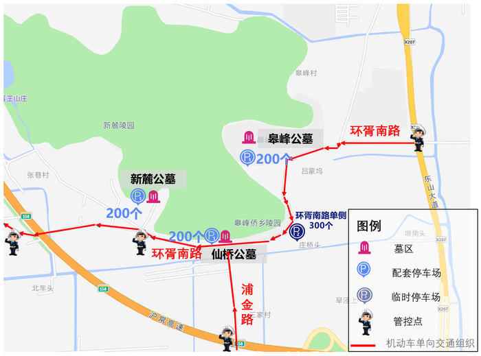 为保障清明节期间群众祭扫出行,市区两级公安交警、民政部门、墓区统筹协调,“一点一策”制定各墓区行车线路、停车场所、分流点位。同时,在高架、地面道路和墓区周边单行交通组织道路主要节点增设墓区交通指引牌。