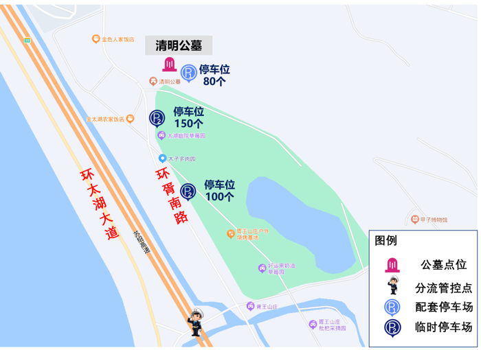 停车数量:墓区配套停车位100个,分流点周边临时停车位约80个;