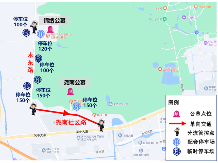 行车线路绕城高速石湖出口——友新快速路——文溪路——龙翔路——吴中大道——旺山墓区、清泉墓区;