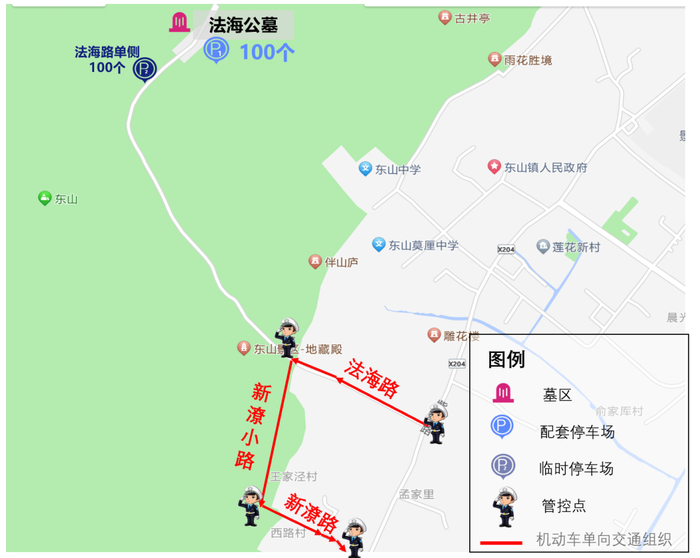 停车数量:东山法海墓区停车位100个,路侧临时停车位约100个;