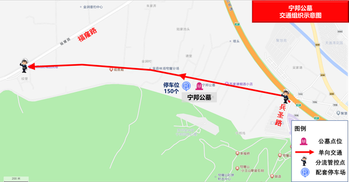 停车数量:墓区配套停车位30个,分流点周边临时停车位约200个;