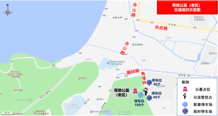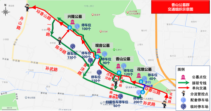 行车线路:子胥快速路(高速西山出口)——孙武路——陈华路——环香山路进入各墓区,祭扫结束后从环香山路——炙鱼路——普济路——舟山路驶离;