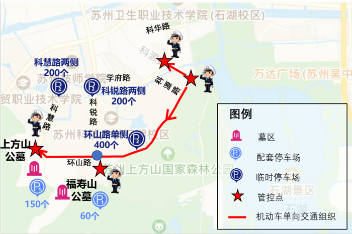 停车数量:上方山、福寿山墓区配套停车位150个,墓区周边单行线环山路临时停车位约400个,分流点周边临时停车位科锐路两侧约200个、科慧路两侧约200个;