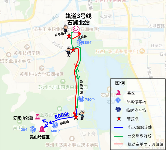 停车数量:吴山岭3个墓区配套停车位120个、弥陀山墓区配套停车位60个,临近上方山动物园2个停车场约1300个,分流点周边石湖景区管理处停车位380个、横越路临时停车位约80个;