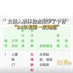 【#24岁女孩入职体检查出少一个肾#:不影响生活,将检查是否双子宫】#24岁女孩入职体检发现少了个肾#3月27日,山东青岛。24岁女孩毛毛入职体检时,被医生发现少了一个肾,经CT检查,确诊为先天性左肾缺如。询问爸妈后得知,他们早就知道这件事,曾多次咨询专家,被告知不影响健康。毛毛表示,自己从小到大对此事不知情。单肾对生活没有什么影响,自己一直很健康,也不影响考公考编。听说单肾女性双子宫概率较高,自己之后会去进行检查。@白鹿视频