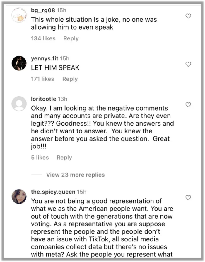 而且听证会本来就是议员们表演的时间,之前两次听证会,TIK TOK没派人参加他们还是在那表演。