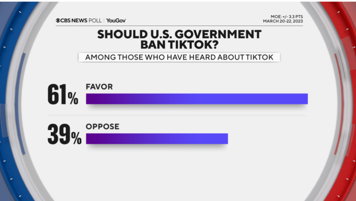 在听证会之前,CBS做过一次民意调查,显示61%的受访者认为美国政府应该把TIK TOK给禁掉。