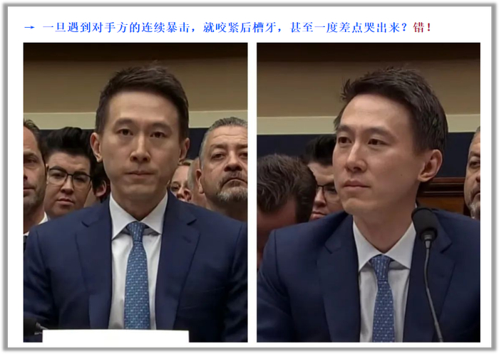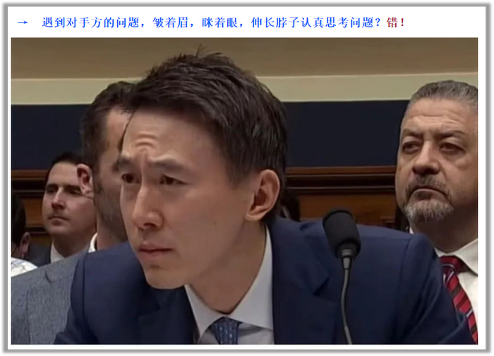 恰恰相反,我觉得他每一句话、每一个动作、每一个表情都刚刚好。每一处都让人感觉他是被欺负的那个文明人,而那些议员则是只会摆出恶狠狠的姿态,要把TIK TOK抢走的讼棍强盗。