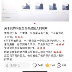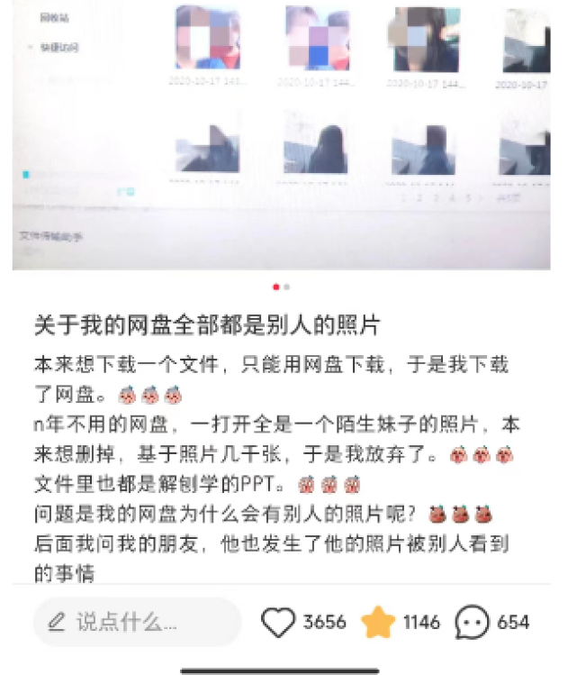 近日,小红书用户“金小鹿”发帖表示,自己许久没用的某平台网盘打开后,竟然出现了几千张其他人的照片,还有大量的医学资料PPT。“金小鹿”非常疑惑:自己的网盘,怎么会有别人的照片呢?