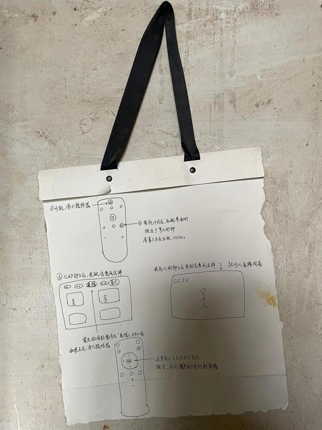 为了防止奶奶忘记操作,看不了电视,杨琼把操作流程画在了纸上,并做成了手提袋的样式,挂在电视机旁。现在,如果没有弹窗意外出现,连紫英有时也能开机找到直播节目。