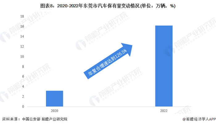 截至2020年,东莞市汽车保有量340.96万辆,五年年均增长13.2%,城市汽车保有量位居全省第二(仅次于深圳),全国第十。新能源汽车保有量3.15万辆,占整体汽车保有量的0.92%,其中,公交车6330辆,实现公交纯电动化率100%。根据公安部统计数据,2022年东莞市汽车保有量规模达到16.16万辆,相较于2020年年复合增速达到126.5%。