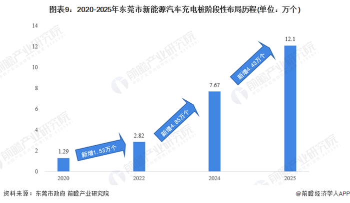 根据东莞市《东莞市汽车能源基础设施“十四五”规划》,截止2020年底,已有充电设施运营企业80多家、运营平台超过25个,全市已建充电站约500座,换电站3座,高速公路服务区充电站12座,初步形成城际高速出行充电网络,全市32个镇街实现充电网络全覆盖,充电桩建设数量约1.29万个。到2025年,实现车桩比达1.2:1水平,充电桩达到12万个。