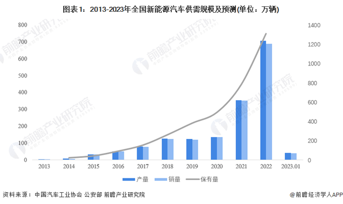 新能源汽车是我国应对气候变化、推动绿色发展的战略举措,在政策和市场需求的推动下,我国新能源汽车产销量双双增长,2022年,2022年新能源汽车产销分别完成705.8万辆和688.7万辆,同比分别增长96.9%和93.4%。。同时,据公安部数据显示,截至2022年底,全国新能源汽车保有量达1310万辆,占汽车总量的4.10%,扣除报废注销量比2021年增加526万辆,增长67.13%。 其中,纯电动汽车保有量1045万辆,占新能源汽车总量的79.78%。2023年1月,新能源汽车产销分别达到42.5万辆和40.8万辆,环比分别下降46.6%和49.9%,同比分别下降6.9%和6.3%,市场占有率达到24.7%。与2022年春节月2月份相比,产销分别增长15.4%和22.2%。