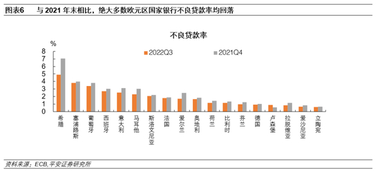 欧元区银行业不良贷款率降至低位。近年来,欧元区银行业不良贷款率持续下滑,由2015年二季度的7.31%大幅降至2022年三季度的1.79%,不良贷款总额也降至3450亿欧元。欧元区不良贷款率的持续下滑,一方面是由于银行信贷的持续扩张,做大了不良贷款率的“分母”。另一方面,不良贷款证券化等方式也对欧元区银行业不良贷款率的下降起到了积极作用。如近年来意大利等国陆续出台了政府支持的不良贷款处置计划,并完善了相关的证券化法律法规,希腊、爱尔兰等国亦出台了类似的政策。事实上,与2021年末相比,绝大多数欧元区国家银行的不良贷款率均已明显回落。