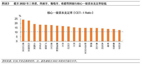 分地区看,西班牙、葡萄牙、希腊等国银行核心资本充足率较低,但仍远高于监管要求。除了关注欧元区银行业的整体情况,也需关注中心-边缘国家差异,以及边缘国家是否会成为银行危机爆发的薄弱环节。横向对比来看,位于西班牙、葡萄牙、希腊、奥地利、意大利等国银行的核心一级资本充足率相对较低,而这些国家多数也是在欧债危机中经济金融受冲击最重的国家。此外,德国、法国等欧元区“中心国家”资本充足率同样偏低,其核心一级资本充足率仅高于意大利、希腊等国一个百分点左右。不过,欧央行对于2022和2023年成员国银行的最低CET1指引水平分别为10.4%和10.7%,可见包括西班牙等国在内的所有成员国银行业核心资本充足水平均明显高于监管要求。