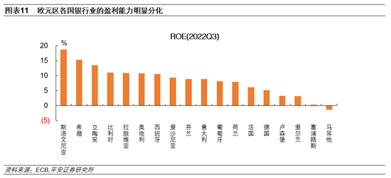 从地区看,欧元区各国银行业的盈利能力明显分化。斯洛文尼亚、希腊、立陶宛、比利时、拉脱维亚等国银行业净资产收益率(ROE)水平较高,均在10%以上,而法国、德国等国银行业ROE水平均在7%以下,部分经济体银行业ROE甚至低于0。这一现象再度说明,欧元区各国银行业经营状况存在明显分化,尤其是德国、法国等“中心国家”银行业的抗风险能力可能并不如市场预想得那般乐观。