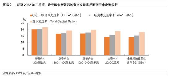 分规模来看,欧元区大型银行的资本充足率反而低于中小型银行。与美国及中国不同的是,欧元区中小银行的资本充足状况明显好于大型银行。从核心一级资本充足率来看,截至2022年三季度,欧元区总资产小于300亿欧元银行的核心一级资本充足率达到20.0%,而总资产大于2000亿欧元的大型银行该指标仅为14.3%,其中全球系统重要性银行(G-SIBs)仅有13.9%。之所以出现这一差异,可能是因为欧洲大型银行业务类型更广、覆盖地区更多,尤其大型跨国银行在美国等海外业务上因市场准入、信息不对称等原因面临更激烈的竞争,在当地相当于扮演着“中小银行”的角色,继而资产质量相较聚焦于欧洲本地业务的中小银行更逊一筹。此外,欧元区70%的企业融资来自银行,美国的这一占比不到30%(企业更依赖直接融资),也侧面反映出欧洲银行在本地业务和美国业务的“门槛”有别。