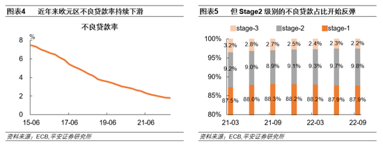 不过,不良贷款的结构变化可能暗示着欧元区银行业资产质量继续改善的空间不足。根据《国际财务报告准则第9号》(IFRS 9)对金融资产减值阶段的划分,随着信用风险恶化,不良资产会从Stage 1(次级类)转移到第二(可疑类)和第三阶段(损失类)。截至2022年9月,欧元区银行Stage 2的不良资产占比开始反弹,而 Stage 2+Stage 3的不良资产占比则较 2021年9月上升了 0.4个百分点。这或表明,欧元区银行业的资产质量继续改善的空间有限,边际恶化的压力有所上升。