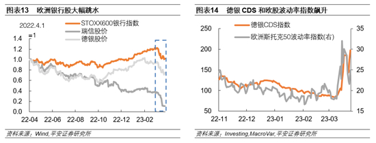 三是,围绕美欧银行业前景的恐慌情绪仍在蔓延。3月初硅谷银行事件爆发后,全球资本市场恐慌情绪明显升温,标普500VIX指数由3月初的不到20一度蹿升至30以上,美欧银行股均受到了一定的“非理性”冲击,法国兴业银行、意大利裕信银行等机构股价同样大幅收跌。