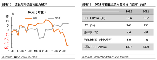 其次,德银2022年财报显现极强韧性。尽管2022年欧元区经济以及银行业基本面整体下行,但德银几乎所有财务指标都“逆势”向好:2022年其归母净利润达到50.3亿欧元、大幅增长159%,流动性覆盖比率提高9个百分点至142%,核心一级资本充足率提升0.2个百分点至13.4%(远超目标的12.5%)。对比来看,同期瑞信不仅亏损扩大至80亿美元,其流动性覆盖比率、核心一级资本充足率等指标也出现了显著的下滑。