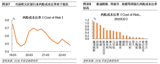 欧元区银行风险成本比率保持低位。风险成本比率(Cost of Risk)是指银行贷款损失准备金与按摊销成本计算的净贷款总额的比值。一般而言,风险水平较高的银行有较高的贷款损失准备金,其风险成本比率也相对较高。当前,欧元区银行业风险成本比率仍处低位:截至 2022年三季度,该指标仅为0.48%,仅高于2019年三季度的低点1BP。较低的风险成本比与不良贷款率的走低相一致。不过从国别来看,欧元区各国银行业的风险成本比率存在较大差异。截至2022年三季度,塞浦路斯、西班牙、希腊、斯洛文尼亚等国银行业风险成本比率仍处于0.7%以上的高位,明显高于欧元区其他国家银行。