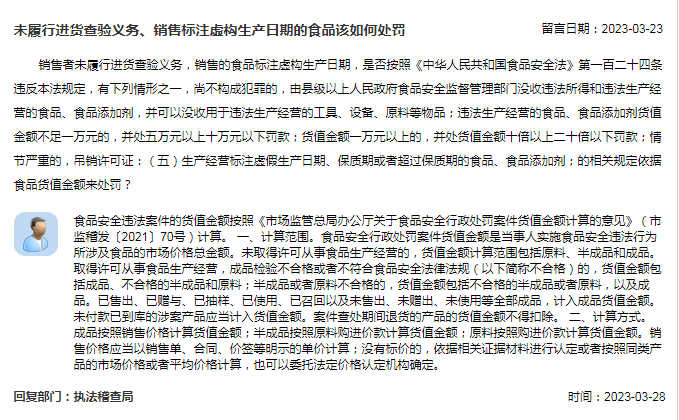 未履行进货查验义务、销售标注虚构生产日期的食品,该如何处罚?市场监管总局回复