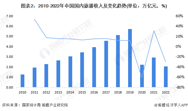 2010-2021年,中国国内旅游收入先升后降态势,下降主要源于疫情影响。2020年,中国国内旅游收入为2.23万亿元,相比2019年下降61.07%。2021年,随着疫情形势有所好装,国内旅游收入有所回升,为2.92万亿元,相比2020年上升30.98%,达到2019年50.99%的水平。2022年全年国内旅游收入2.04万亿元,比上年减少0.87万亿元,同比下降30.0%。