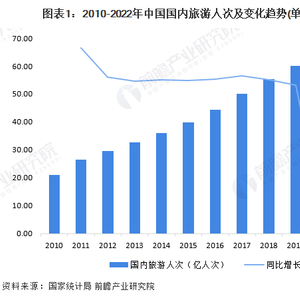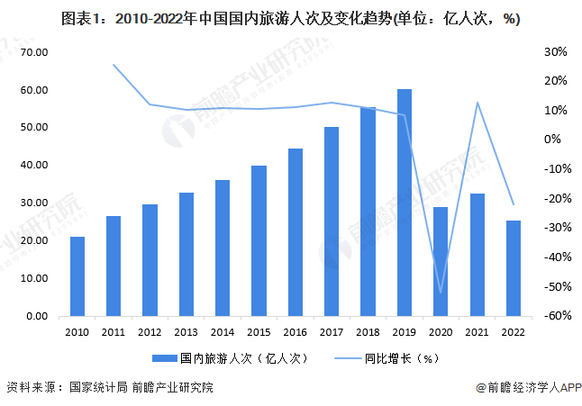 根据国家统计局数据显示,2010-2019年,中国国内旅游人次逐年上升,2019年达到60.06亿人次。2020-2021年,受疫情影响,中国国内旅游人次大幅下降。2020年,中国国内旅游人次为28.79亿人次,相比2019年下降了52.06%。2021年,国内旅游总人次32.46亿,比上年同期增加3.67亿,增长12.75%。(恢复到2019年的54.0%)。根据国内旅游抽样调查统计结果,2022年,国内旅游总人次25.30亿,比上年同期减少7.16亿,同比下降22.1%。