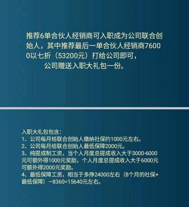 对于合伙人,一次性向公司交53200元。合伙人的权益为:推荐奖为37%,补货奖为16%。合伙人招募一名合伙人,奖励11%(8360元)。