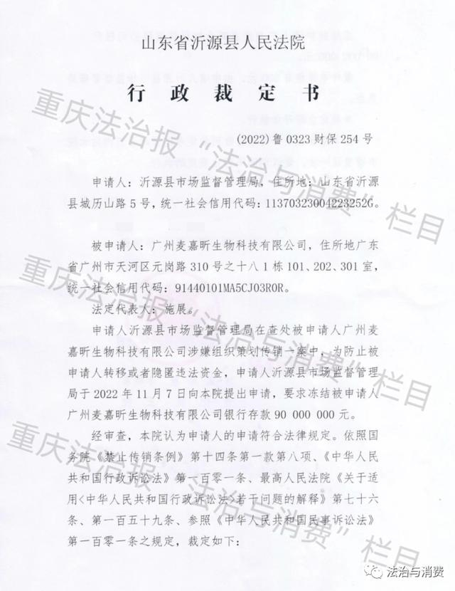 今年2月份,重庆法治报《法治与消费》发布消息称,山东省沂源县人民法院发出行政裁定书,内容为2022年10月,沂源县市监局接到群众举报,称广州麦嘉昕生物科技有限公司涉嫌从事组织策划网络传销活动。沂源县市场监督管理局要求冻结该公司银行存款9000万元。