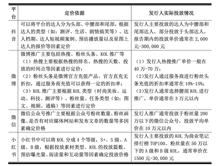 未来穿戴回复监管的公告中显示,购买一条微博热搜推广的价格在40万-70万元左右,腰部KOL单价通常在3万以内,抖音达人的单价在2000元-30万元之间,小红书KOL的单价在1500元-3万元之间。