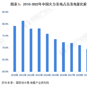 随着清洁能源的不断发展渗透,2010-2022年,中国火力发电占总发电量比重整体呈现下降趋势,2022年中国火力发电占总发电量比重下降至69.8%,同比增长1.8个百分点。尽管火力发电的占比逐渐减小,但其发电量仍然超过我国总发电量的一半,火力发电量依然是我国电力生产的支柱。