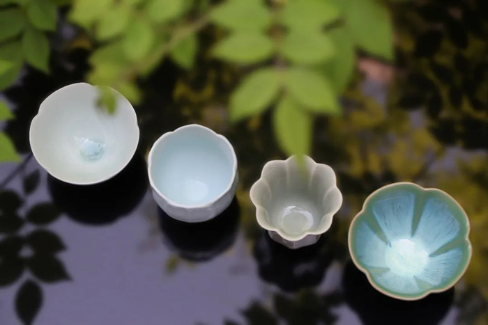 以花形造器型,将风雅迷人的中国色入釉,融入花形茶器之中,似一朵朵被中国色浸染的花朵。