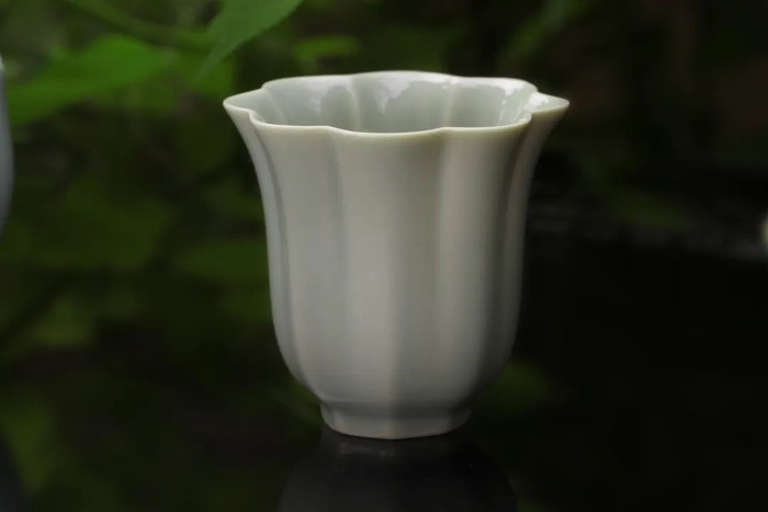 器型借鉴宋代的经典器型,杯口以葵花入形,素净端庄,有着如宋代器物般独特的清雅风骨。胎骨轻盈,釉色温润如玉,釉面有随机开片纹,愈养愈漂亮。
