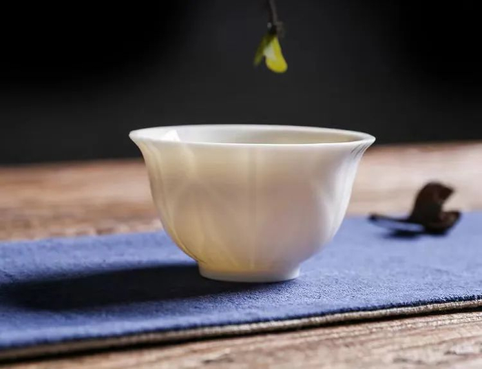 以德化白瓷本色表现,质地坚密,晶莹如玉。器型设计融入荷花造型,盈盈一握,圆润通透。