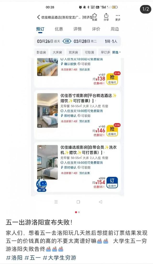 “五一出游洛阳宣布失败!”这是小红书某用户最近发出的感叹。她表示自己是一名大学生,本计划在五一期间前往河南洛阳游玩几天,正打算提前订酒店的时候,发现洛阳某酒店的价格从100多暴涨到将近1800元!