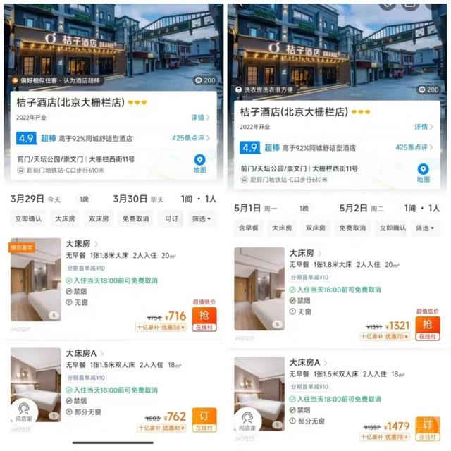 记者通过多家电商平台搜索发现,尽管距离五一还有较长时间,但北京天安门、南锣鼓巷,上海外滩、迪士尼度假区,成都春熙路、太古里、长沙五一广场等热门商圈附近很多酒店显示已满房,而且价格普遍有所上涨。以成都为例,全季酒店(成都春熙路IFS国金中心店)3月29日“高级大床房”的价格为464元/晚,但5月1日的价格就上涨到了739元。