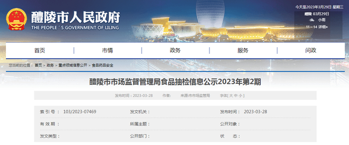 湖南省醴陵市市场监管局公示2023年第2期食品抽检信息