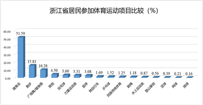 报告显示,浙江省居民平时参加运动项目最多的是健身走,比例为51.59%,跑步与广场舞/健身操比例分列第二、第三位,为15.81%和10.28%。