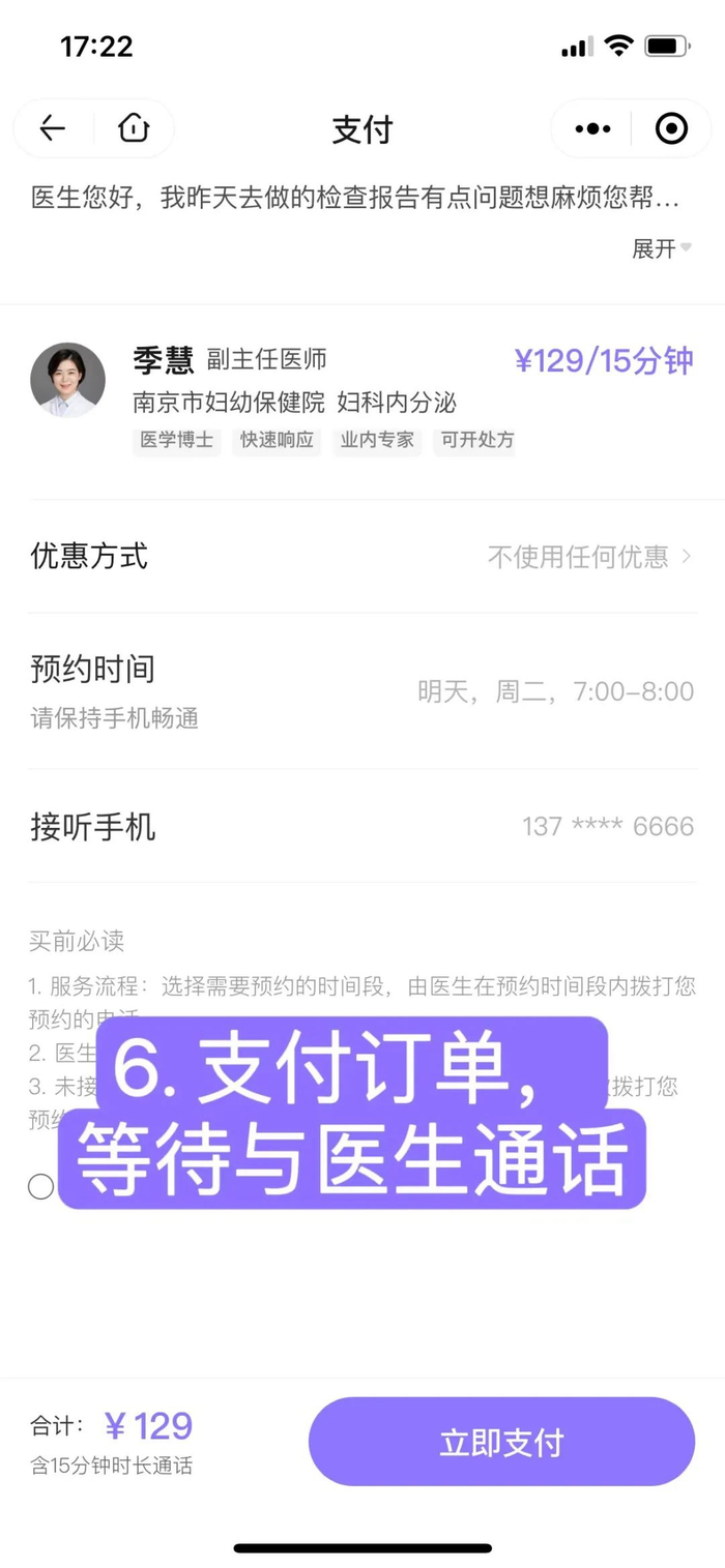 然后在预约的时间保证电话通畅,准备好和医生沟通就可以了。电话咨询一共有 15 分钟,医生能够更好地了解病情,也可以获取更详细的治疗方案和护理建议。