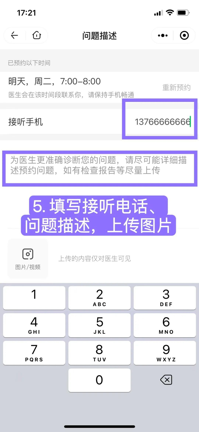 5. 填写手机号和问题描述,如果有病历、检查结果等,也可以拍照上传
