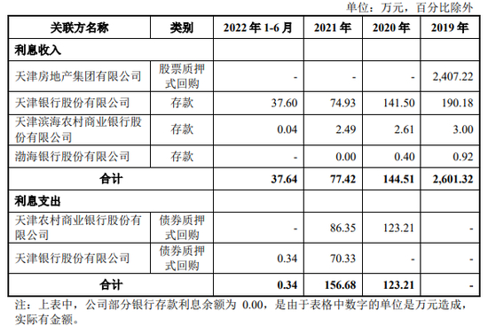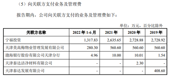 2019年,2020年,2021年和2022上半年,渤海证券向关联方渤海银行天津分行支付业务及管理费。
