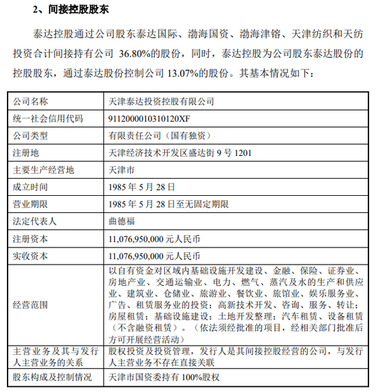 据渤海证券签署于2023年2月23日的招股书,天津市泰达国际控股(集团)有限公司(简称:泰达国际)为其控股股东,泰达控股为间接控股股东,天津国资委为实控人。